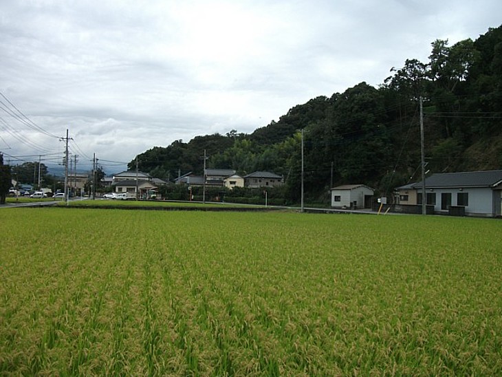 東昌寺前の小道から「薬師の段」の小山(山裾の人家裏手)を見る。右手200mに東昌寺。