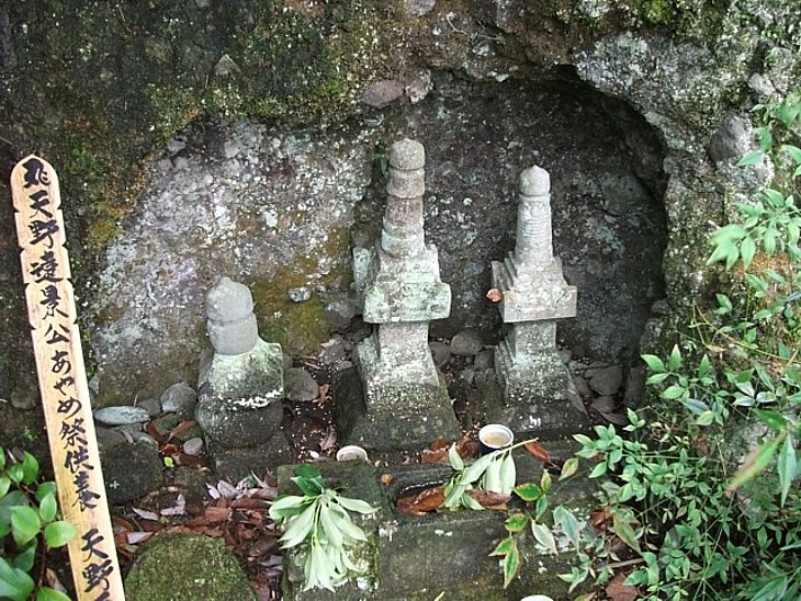 岩棚に設けられた墓所。中央が天野遠景、左が嫡男政景、右に弟光家の宝篋印塔が並ぶ。
