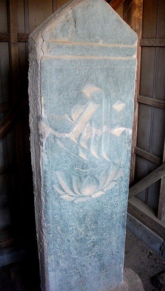 境内から出土した義助を弔う秩父青石板碑の上部。康永元年壬午六月五日逝去、とある。