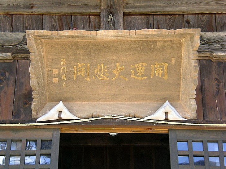 金文字で「開運大悲閣」と書かれた本堂の扁額。その左は...毘門義氏と読めるが、詳細は判らない。