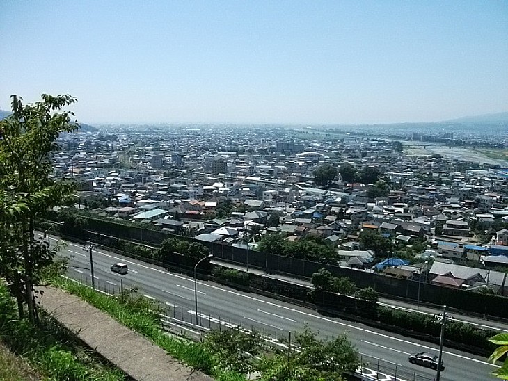 松田惣領の丘から小田原方向を。直下に東名、右上に足柄峠に向う県道78号が見える。