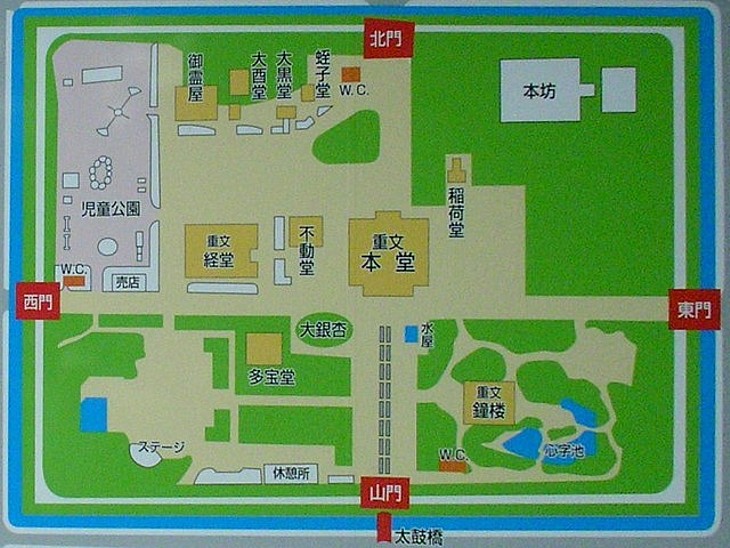 鑁阿寺の敷地は一辺約200m。四方に門、中央に大御堂(大日堂)を置く伽藍配置だ。