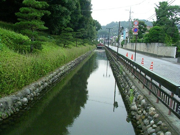 北東の角から西を撮影。南の堀がやや広く、他はほぼ同じ。出入り口は四方の門のみ。