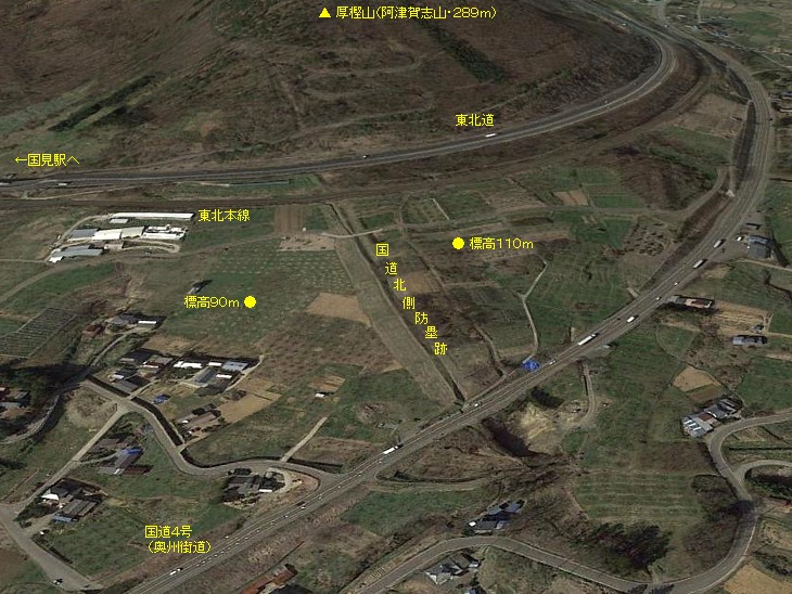 比較的保存状態の良い「国道北側防塁」鳥瞰図。堅塁の筈なのに、僅か数時間で破られた。