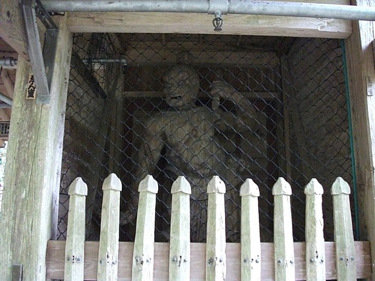 山門の左側に立つ力士像・阿行。鎌倉時代初期の慶派の作とされる県指定の文化財。
