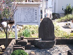 右: 500mほど北西の鶴峯八幡宮参道に沿った民家に建つ弁慶塚。参道左側にある石柱の碑は民家の迷惑に配慮して最近建てた、らしい。