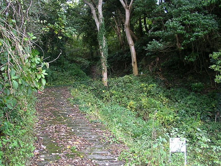 旧道から「椎の木三本」に入る小道。椎の木の枯死は昭和30年代、樹齢約800年だった。