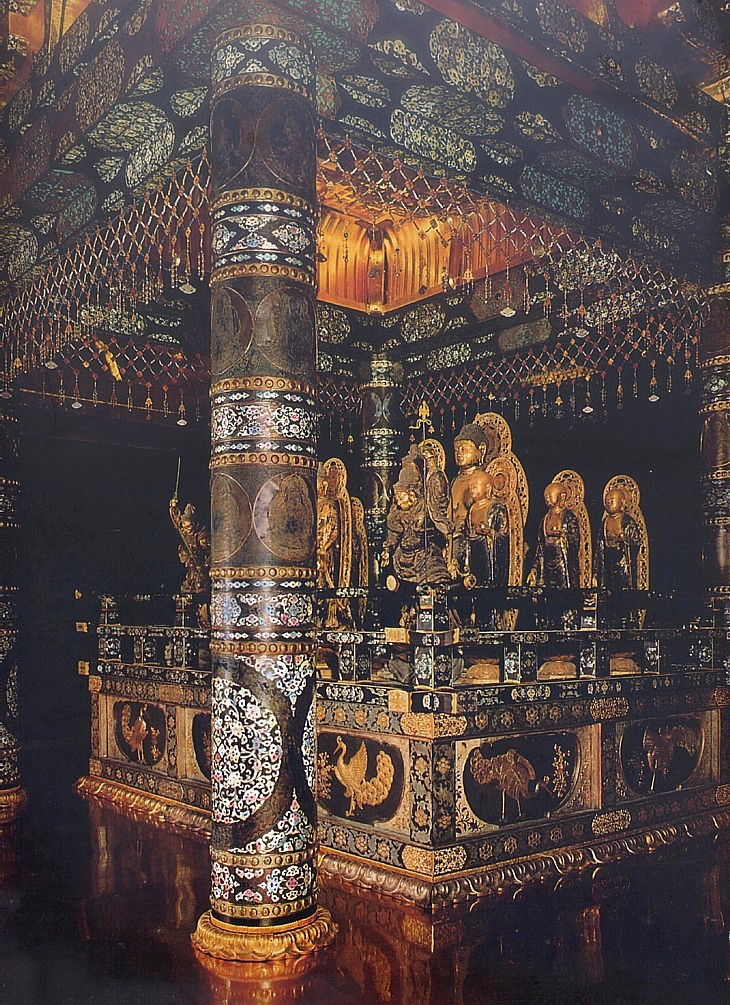 要所に配した透し彫り金具と下地の緑青の対比も美しい。これは正面中央の初代清衡の壇。