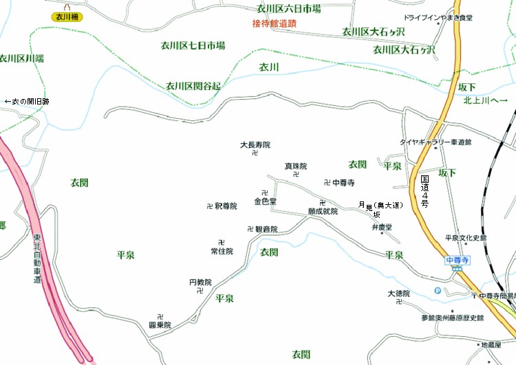 右の勝長寿院(大長寿院の右側にあった)を経て接待館のあった関山北麓の衣川河畔に下っていた。