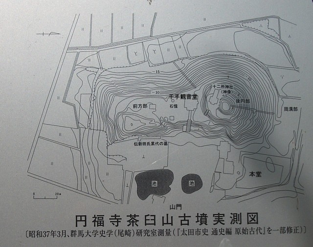 円福寺境内は5世紀前半築造の茶臼山古墳を中心にして伽藍配置され、覆屋には新田氏累代の墓所がある。