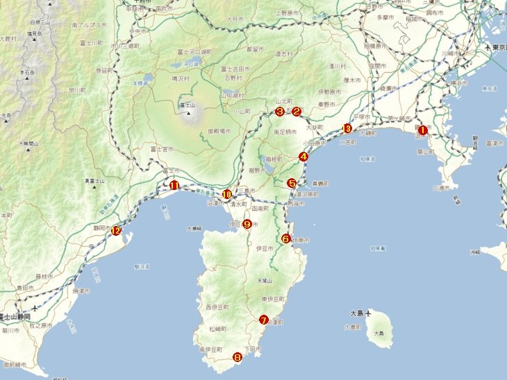 9:韮山 10:黄瀬河本陣 11:富士川合戦場 12:平家本陣(清見寺) 13:相模国府