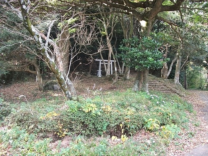 ここが本来の参道入口となる。小さな鳥居と石祠があり木立の中に石段が延びている。