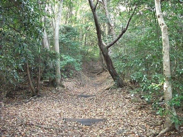 落ち葉に覆われた急傾斜の参道を登る。崩落防止の横木があるだけで足場は悪い。
