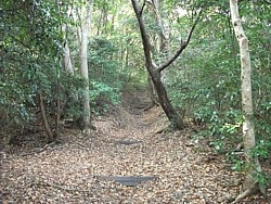 本宮神社は岩戸山を経て 日金山東光寺(別窓)に至るハイキングコースの途中なのだが、開発中の別荘地や舗装道路が混在しているため実に判りにくい。時間の余裕があって歩くのを厭わなければ、伊豆山神社(別窓)本殿の前を左へ進み、子恋の森公園に向う良く整備されたハイキングコースを辿るのが最も簡単で、公園の奥を抜けて別荘地を50mほど歩いた先が参道の入口となる。