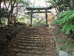 右: 息を切らして300mほど登ると磨り減った石段が現れて鳥居に行き着く。創建当初の構造物なら千数百年を経ている...なんて思うと