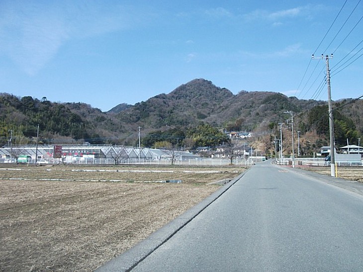高台に見える宅地が千代田団地、背景は大平山。山裾には北江間横穴群が見られる。