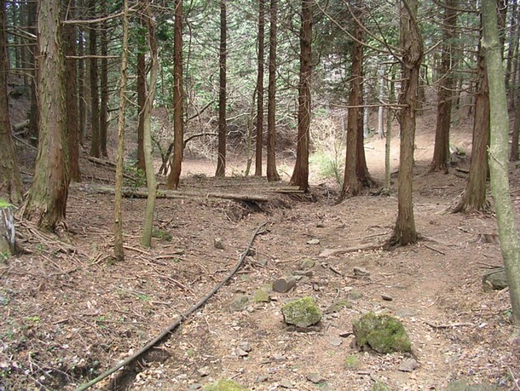 山道を登り詰めた窪地が「自鑑水」。降雨の直後だけ水が溜まり、普段は干上がっている。