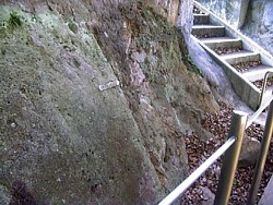 左: 断層のズレ(杭の部分)を石段の上から。続日本後記・承和八年(841)の「伊豆国大地震」の震源も丹那だった事が調査で判明している。