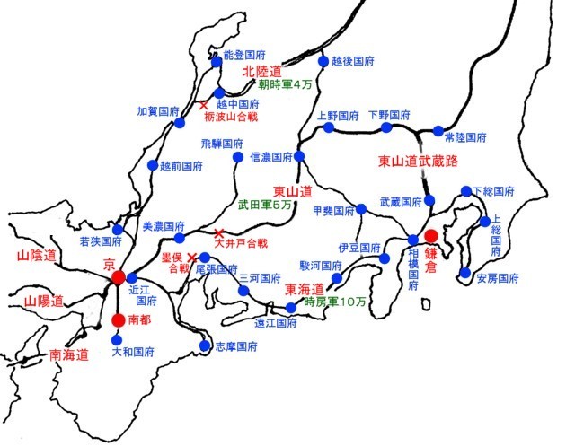 鎌倉郡が攻め上った東海道・東山道・北陸道の進軍ルートと国府の位置。