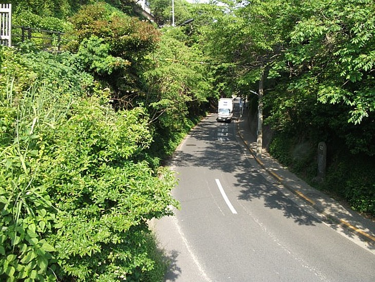 成就院参道から、極楽寺坂を。切通しの切り下げ工事が終った7年後の昭和七年に石碑が建てられた。