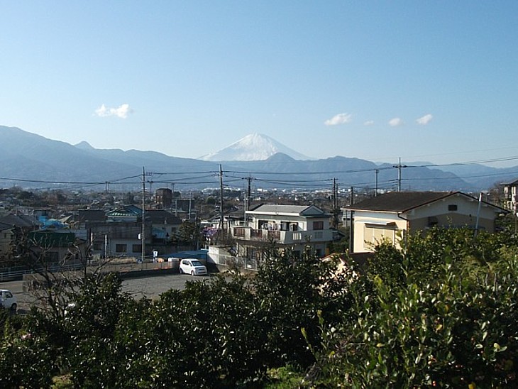 城前寺門前からは冠雪の富士山が。左側の三角は箱根外輪山の金時山(1213m)か。