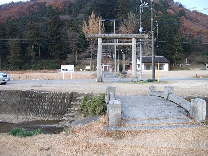 樺崎八幡宮の参道。左手が苑池の跡、右側には地域の集会所と広い駐車場がある。
