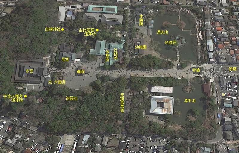 西側から見た鶴岡八幡宮の中心部。舞殿のある平場が鎌倉時代に回廊があった部分と伝わっている。