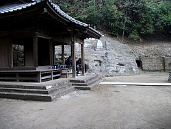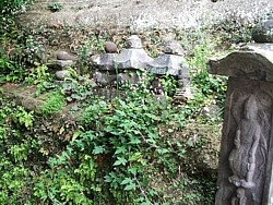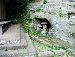 中&右: 舞殿右手には「やぐら」数ヶ所と権五郎景政の供養塔、素性の判らない五輪塔などが残っている。この3枚が改めて撮影した画像。