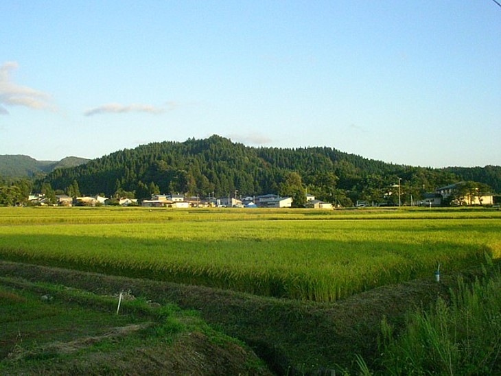 北西から。右隅の建物が資料館、背後の小山全域と周辺が後三年の役最後の戦場となった。