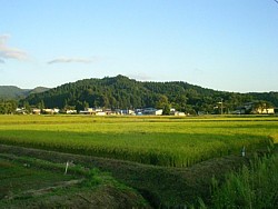 中: 少し北にある道の駅「雁の里せんなん」の前から。右隅の建物が資料館、背後の小山全域とその周辺が後三年の役最後の戦場となった。