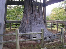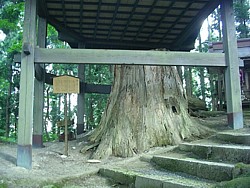 左: 八幡宮本殿に登る参道の折り返し点にある兜杉。功名塚の杉に似ているけど、こちらは金澤の柵を落した義家が戦勝記念に清衡に命じて