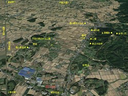 右: 白塀に囲まれた左の建物が後三年の役資料館(入館料100円、費用対効果は大きい)、その左が国道13号、右の山裾に旧羽州街道が