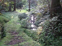 右: 本丸跡東側の遊歩道を約100m下って籠城の水源である金洗い清水へ。「奥州後三年記」に拠れば義家軍は9月に金澤の柵を包囲して
