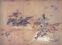 ただいま現代語に変換中で、今年(2012年)の3月末には掲載できると思う。左は草むらに潜む家衡の兵士、右はそれを射る義家軍。