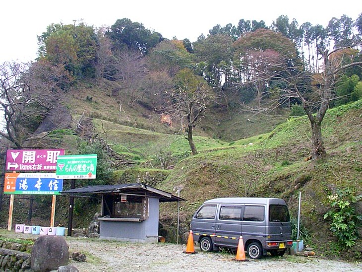 城跡の下には野菜の直売所も開く。国道沿いにある狭い石段が城跡の北東登り口になる。