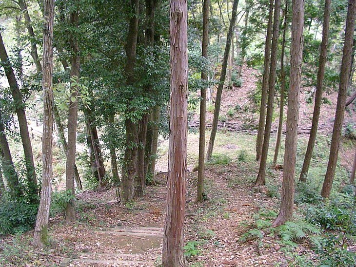 急坂上の平場が独立した東の出丸(外郭)。その先は再び谷となり急坂が東郭へと続く。