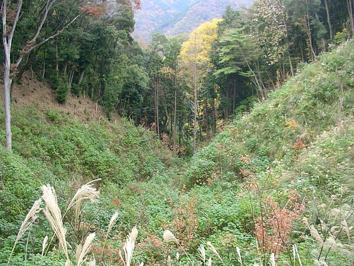 東郭も出丸と似た独立峰で、斜面を左へ迂回して登る。平場は狭く、両側は険しい崖だ。