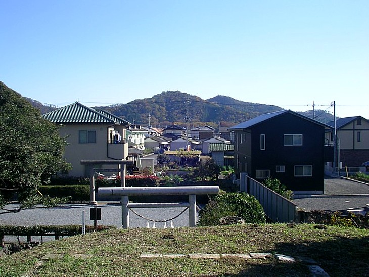 墳墓の上から唐沢山頂を。秀郷は正暦二年(991)に没して東明寺(既に廃寺)に葬られた、と伝わる。