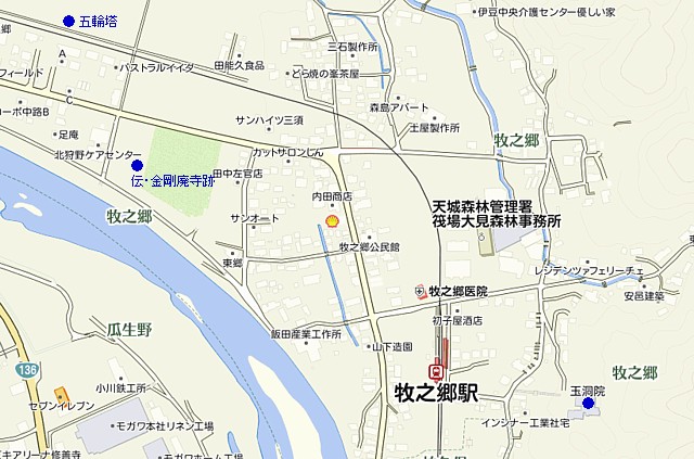 200mほど南の狩野川近くが金剛廃寺の跡で江戸時代には銅製の骨蔵器が掘り出された。背景の中央に見える山の右側が加藤氏館跡と推定される玉洞院(当初は真言密教、現在は曹洞宗)。地図は