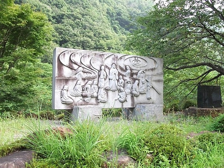 勝頼夫人は侍女16人と共に日川に入水したとも。景徳院前に記念碑が建てられている。