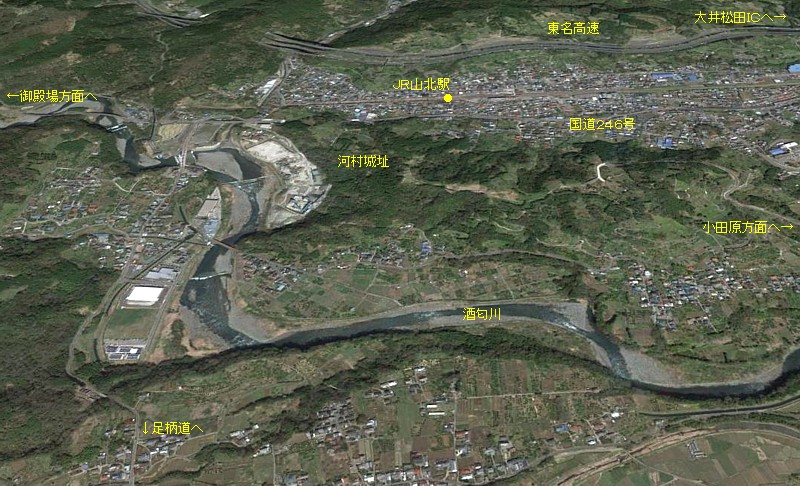 単独峰に築かれた河村城址周辺の鳥瞰図。観光協会のイラストマップは
