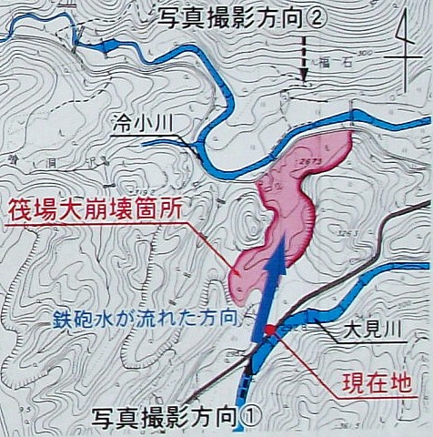 大見川上流の筏場、蛇喰(じゃばみ)山が崩落した現場近くに建てられた案内資料。