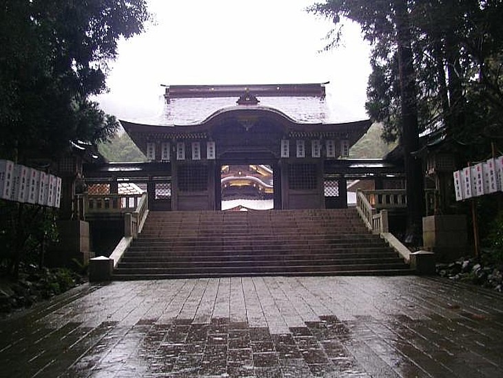 拝殿手前の随神門。二体の随神は熊野から天香山命に従った印南鹿神の息子と伝わる。
