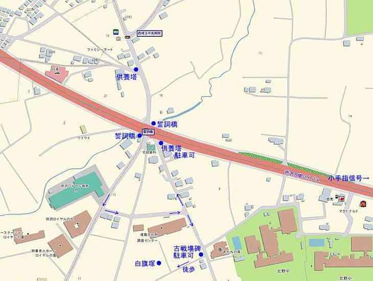 小手指ヶ原合戦場の地図。鎌倉街道は北(画像上)から誓詞橋を南へ進んで合戦場へと続く。