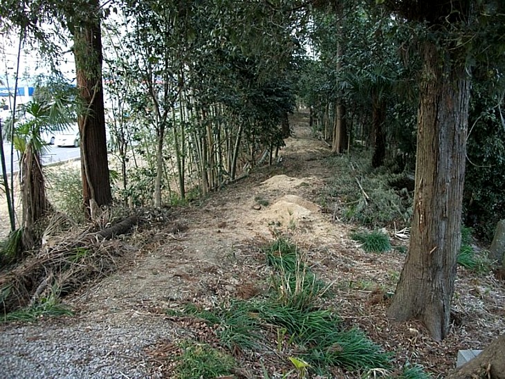 北側に伸びる土塁は本来の形状を髣髴とさせるが左側(西)は既に痕跡を失っている。