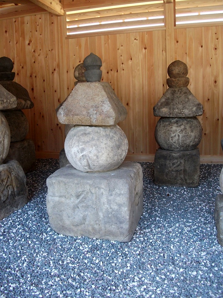 新設の覆屋に並ぶ19基+多少の残欠を含む五輪塔群。大部分が南北朝時代の供養墓と推測される。