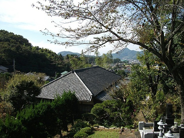 本堂の前から庫裏を見る。伝・兼隆館は左の山の反対側にあり、直線距離で約400m。