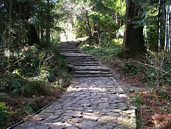 中: 大門坂は石畳と石段が混在する古道で、歩きやすく整備されている。終点に近くなると徐々に傾斜が厳しくなるが、山道よりは歩きやすい。