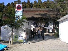 中: 参道前のスナップ。鳥居の向い側、消防署の横に広い無料駐車場がある。看板は初詣だが実際にはまだ12月29日、人出は少なかった。