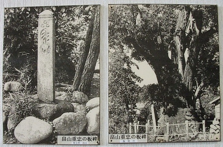 左は川本歴史公園の重忠板碑、右は飯能第六天神社の伝・重忠の墓。どちらも後世の建立。